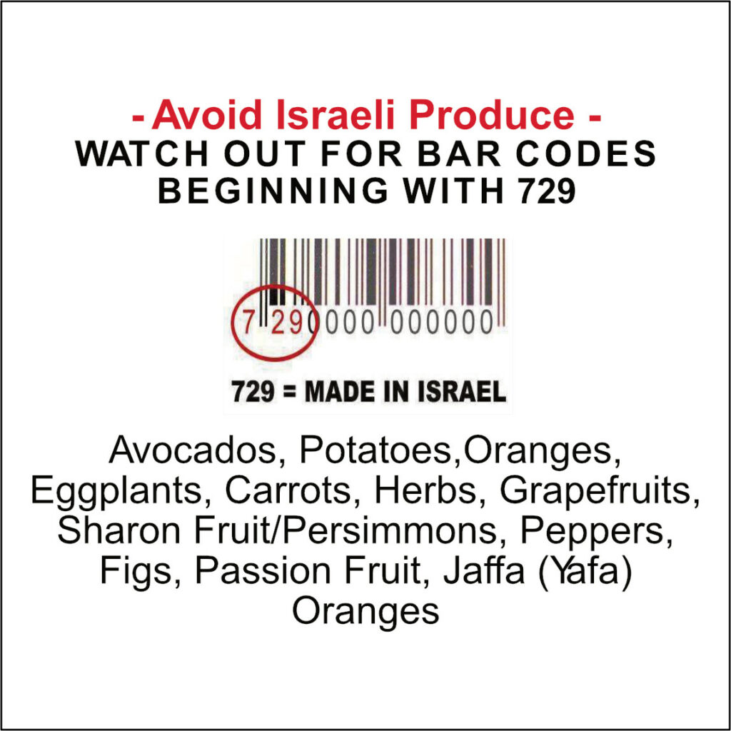 Avoid buying Israeli groceries, which may be identified with “Made in Israel” labels or barcodes beginning with 729. This can include a variety of produce, such as avocados, potatoes, oranges, eggplants, carrots, herbs, grapefruits, persimmons, peppers, figs, passion fruit, or jaffa oranges.