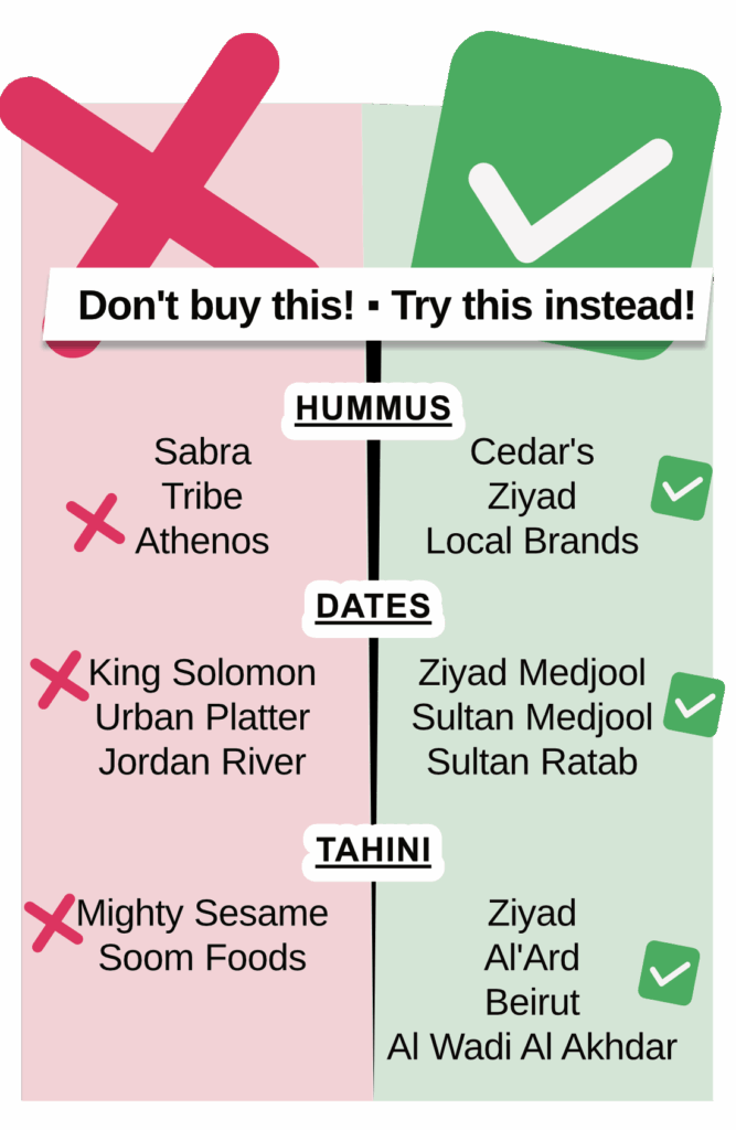 Additionally, avoid Israeli hummus, dates, and tahini. These brands include Sabra, Tribe, Athenos, King Solomon, Urban Platter, Jordan River, Mighty Sesame, and Soom Foods.